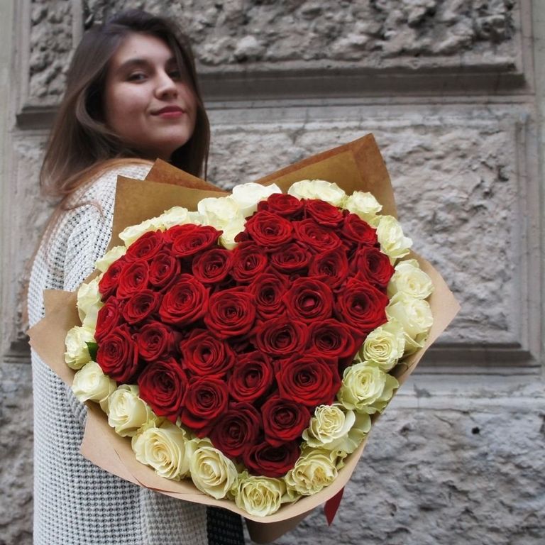 Иидеальная валентинка. Опытные флористы аккуратно выкладывают сердце из 51 ароматной российской розы, которые будут распускаться у получательницы в вазе и будут долго ее радовать.