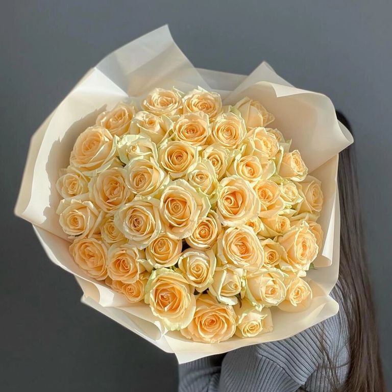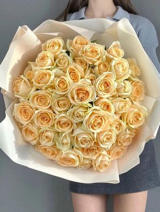 Пышный букет из 51 персиковой розы сорта "Пич Аваланш" — символ тепла и благодарности. Эти стойкие цветы, выращенные в России, отличаются мягким ароматом и ярким оттенком.