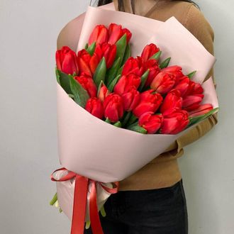 Состав: тюльпан красный - 25 шт, упаковка, лента