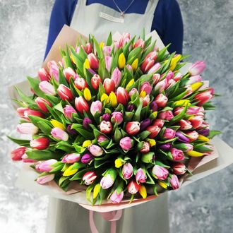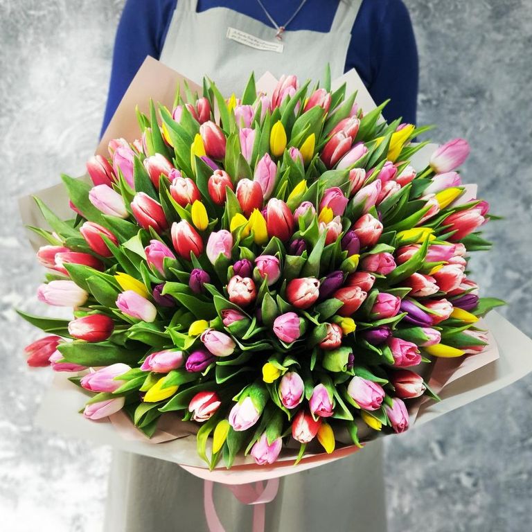 Состав: тюльпан яркий микс - 151 шт, упаковка, лента