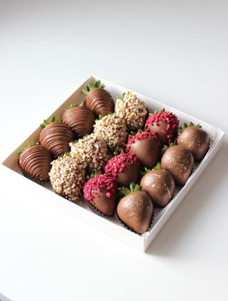 Клубника в премиальном бельгийском шоколаде ручной работы с лёгкой посыпкой орехов и стабилизированной клубники.