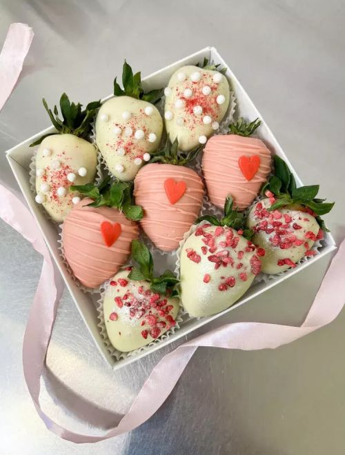 Клубника в белом и розовом бельгийском шоколаде, кондитерские посыпки, сублимированная малина