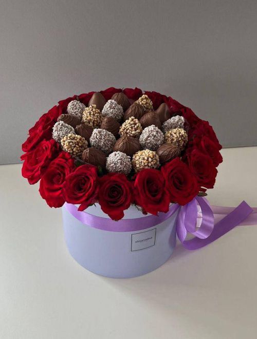 Состав: клубника в бельгийском шоколаде - 25 шт, шляпная коробка, роза Ред Наоми - 19 шт.