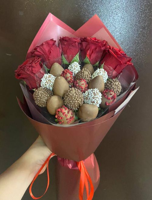 Артикул: 1764 Букет из клубники и роз S 4700 руб. Артикул: 1764 ЗАКАЗАТЬ ПО ТЕЛЕФОНУ В корзину Заказав букет, вы получите в подарок: Открытка Прикормка Инструкция Заказав букет, вы получите в подарок: Открытка Прикормка Инструкция Описание Описание Изысканный букет из 18 клубник в белом шоколаде и 5 свежих роз. Комбинация нежности и элегантности. Быстрая доставка круглосуточно. Наши менеджеры помогут собрать уникальный букет.Состав: 18 клубник в белом бельгийском шоколаде, 5 роз, оформление.